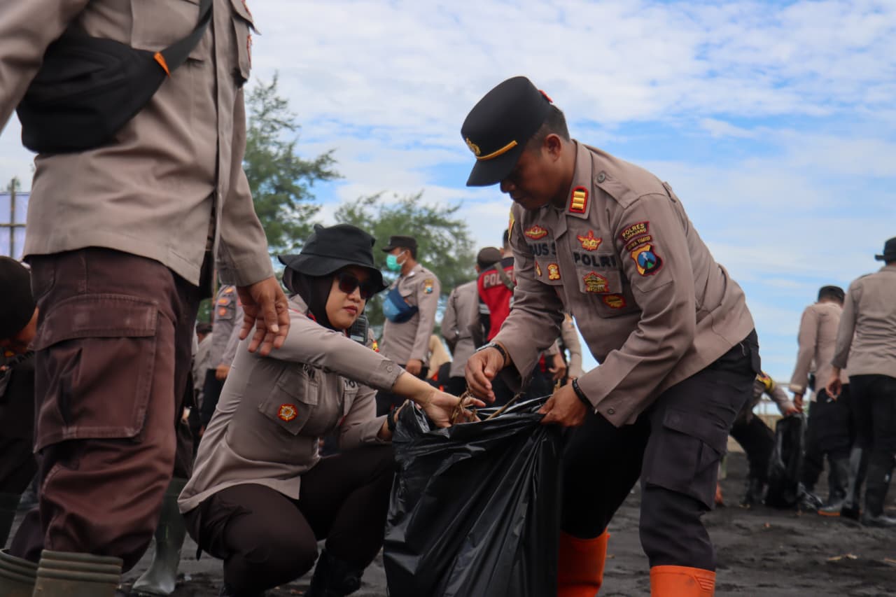 Ratusan personel Polres Lumajang Polda Jatim menyisir bibir pantai membersihkan sampah plastik maupun limbah organik yang terbawa arus laut.
